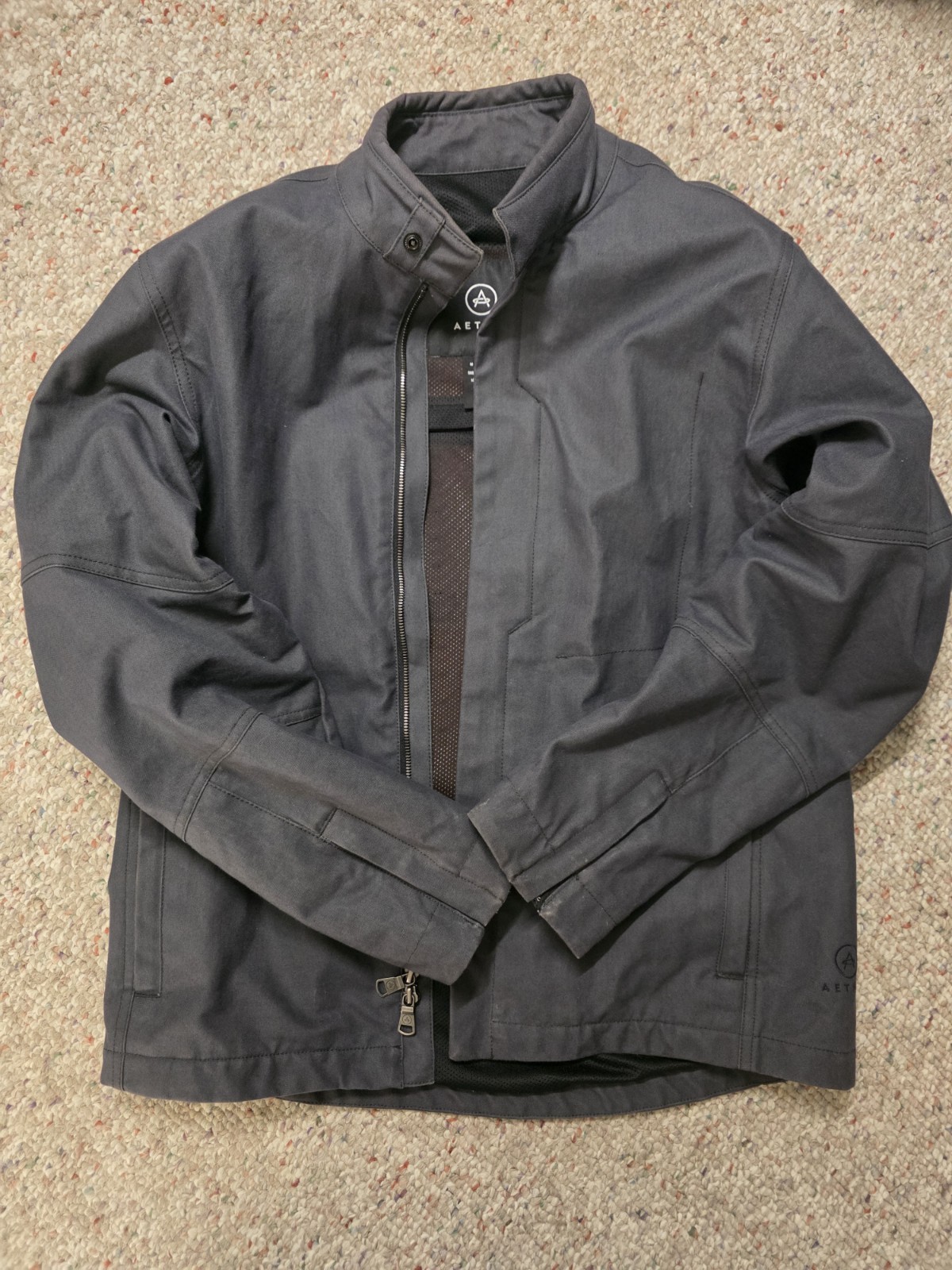 The Aether Motorcycle Jacket in men's size 2M is a stylish and practical outerwear option for casual occasions. Made from durable cotton with a cozy polyester lining, this zip-up jacket features a solid gray color and a regular fit. Perfect for the winter season, this motorcycle-themed jacket also offers machine washable convenience and measures 39 inches in chest. This jacket has back, shoulder, and elbow padding in it as well as zipper vents in the armpit area. Lightly used, please message with any questions.