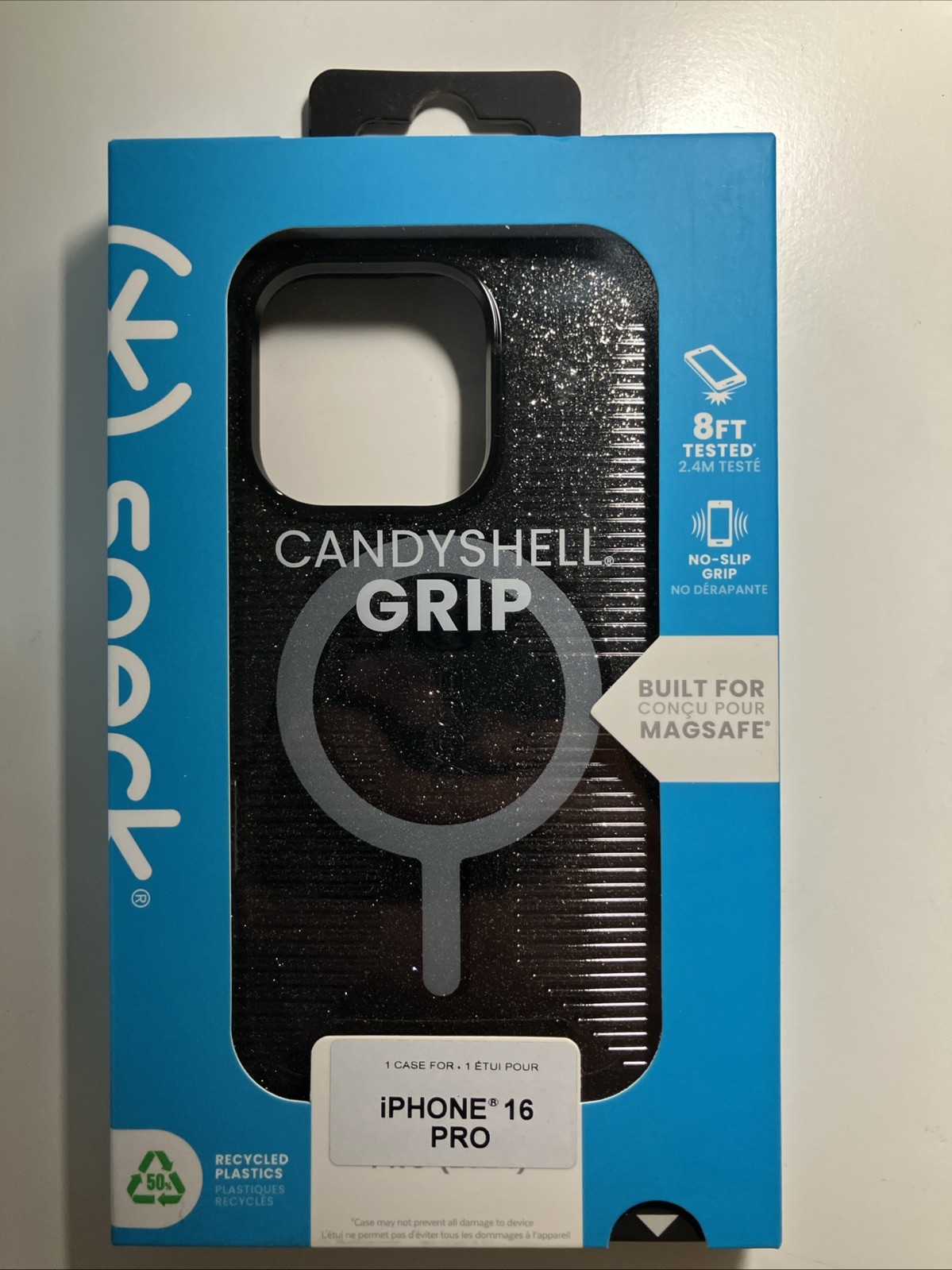 The Speck Candyshell Grip Case is designed specifically for the iPhone 16 Pro, featuring a sleek black color with a glitter finish. This hard case is made of durable plastic and provides shockproof protection, making it ideal for keeping your phone safe from drops and bumps. The case also includes antimicrobial and non-slip features, ensuring both style and functionality. With a lifetime manufacturer warranty, you can trust that your device will be protected for years to come.