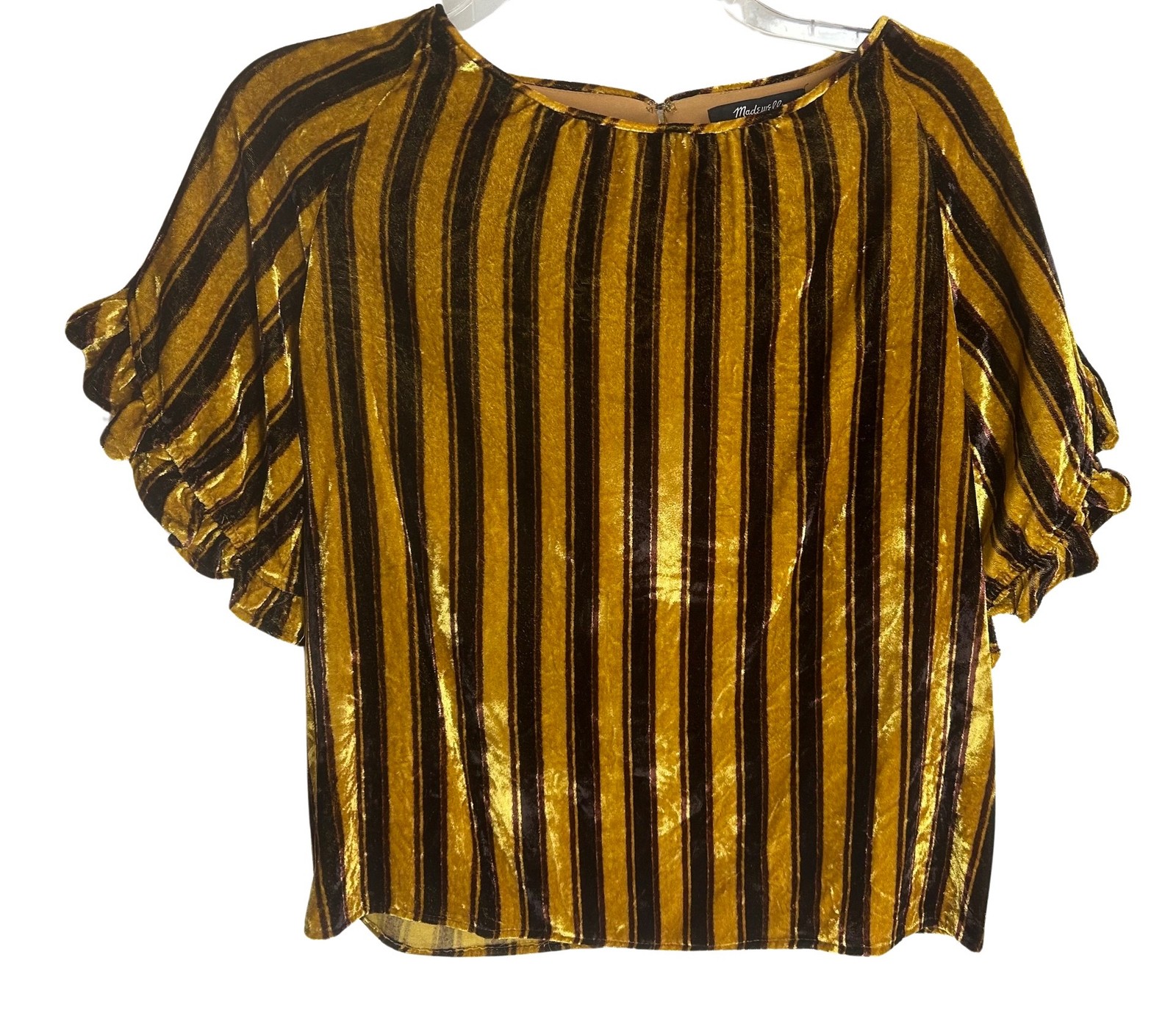 Madewell Velvet Memento Ruffle Top Size XS Yellow Merlot Dk Brown Stripe