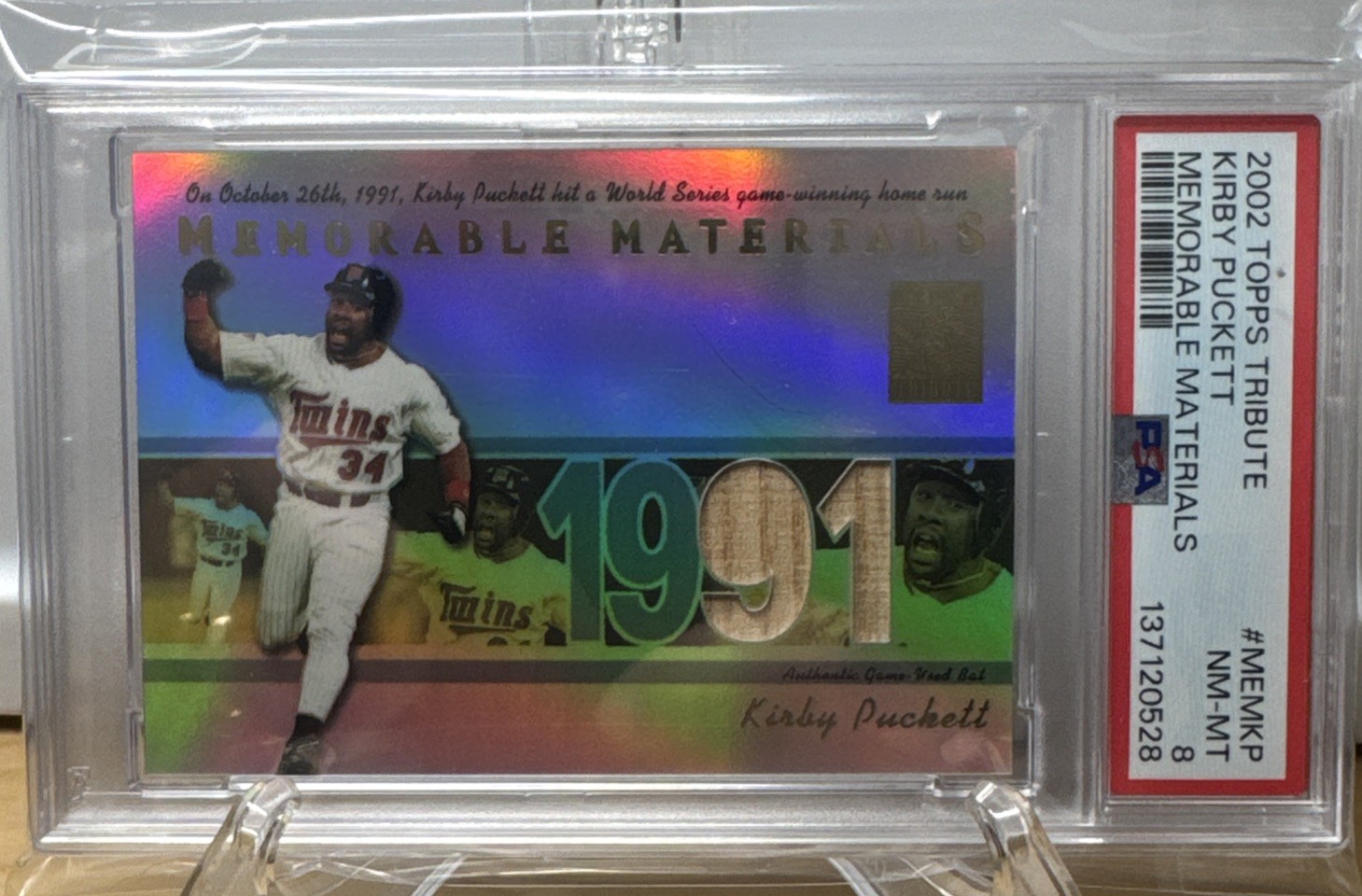 The product is a 2002 Topps Tribute Memorable Materials Kirby Puckett trading card featuring a game-used bat from the Minnesota Twins outfielder. Authenticated by PSA, this English-language sports trading card is an original insert in the Memorabilia set. The card is a standard size and part of the Major League Baseball collection, making it a valuable piece for baseball fans and collectors alike.