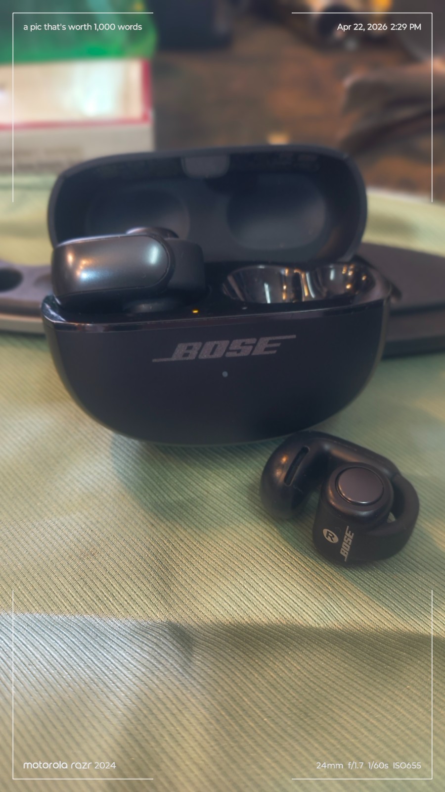 The Bose Ultra Open Earbuds Black are brand new, never-used wireless earbuds featuring active noise cancellation technology. With a sleek black color and a model specifically called Bose Ultra, these earbuds offer a comfortable double earpiece design and a built-in microphone for convenience. They are Bluetooth-enabled for easy connectivity and come with a charger included. These earbuds are perfect for on-the-go use and provide a high-quality audio experience with the trusted Bose brand name.
