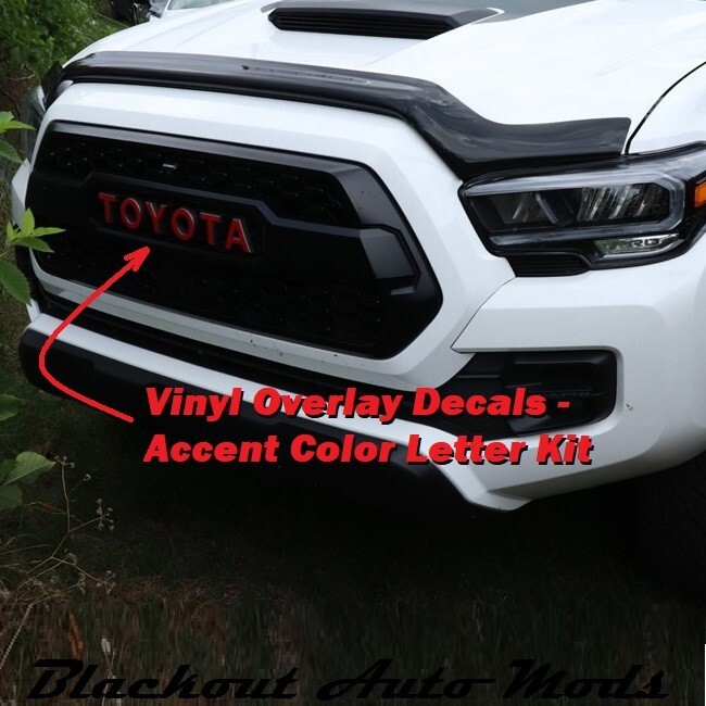 Red Grill Letters for Toyota Tacoma TRD PRO 2016 and Up. This Toyota Tacoma TRDPRO Grill Accent Letter kit is the way to go. Designed specifically for the ALL New redesigned 2016 and Up Toyota Tacoma TRDPRO Pickup.