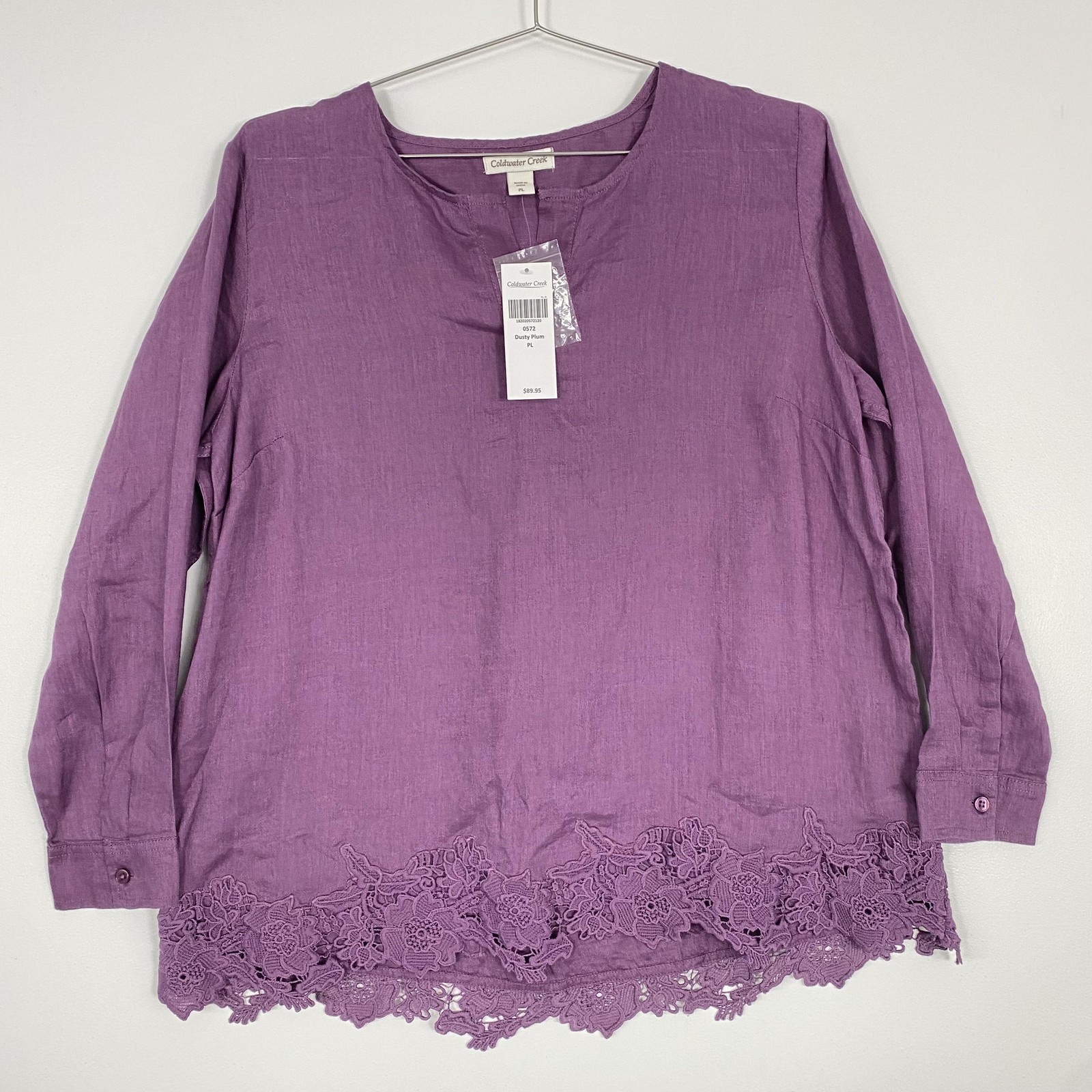 NWT Coldwater Creek Shirt Womens Petite Large Purple Linen Crochet Hem Tunic