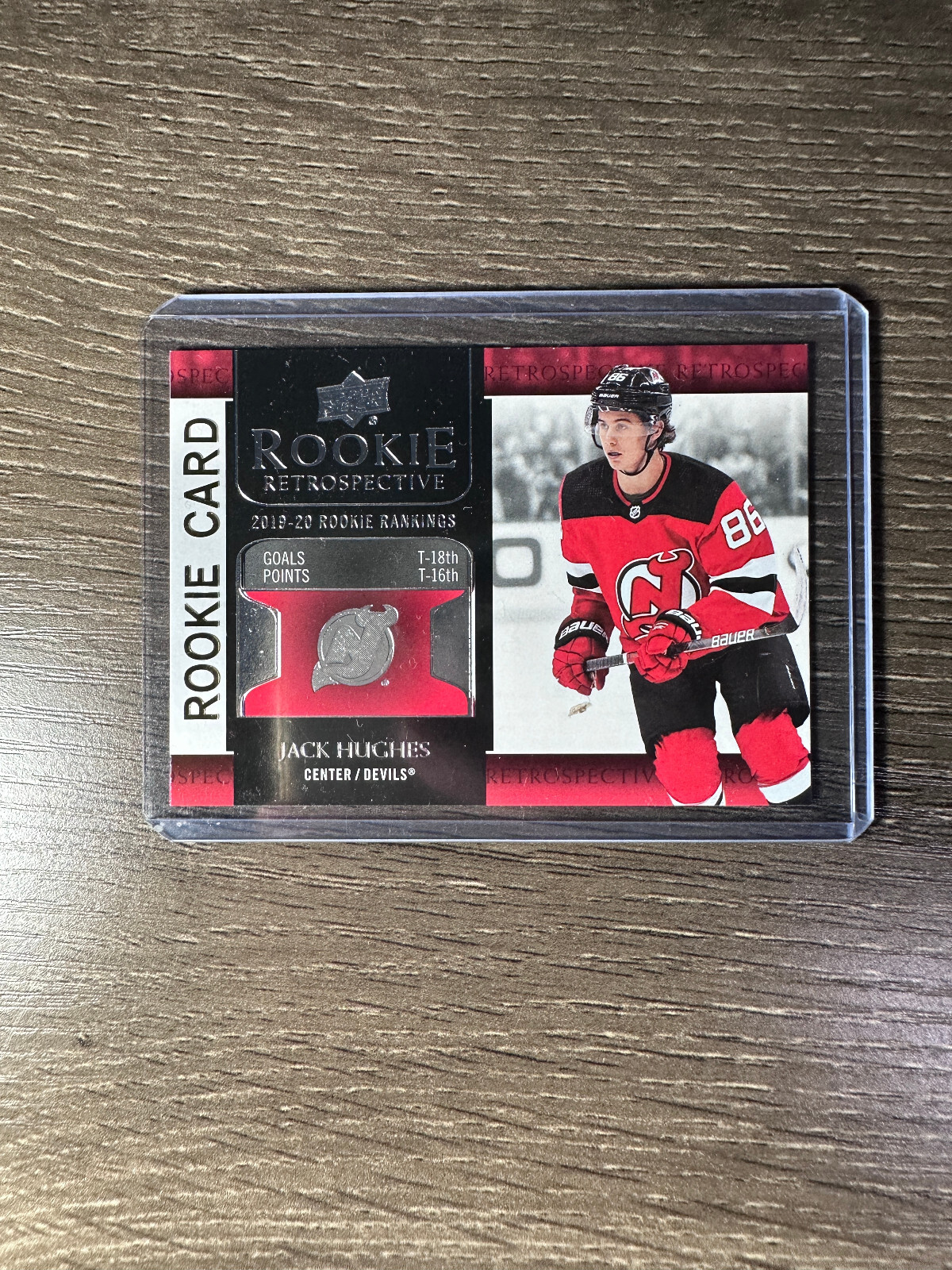Rookie Retrospective Upper Deck 2020-21 RC. Jack Hughes w/ gold ROOKIE case.