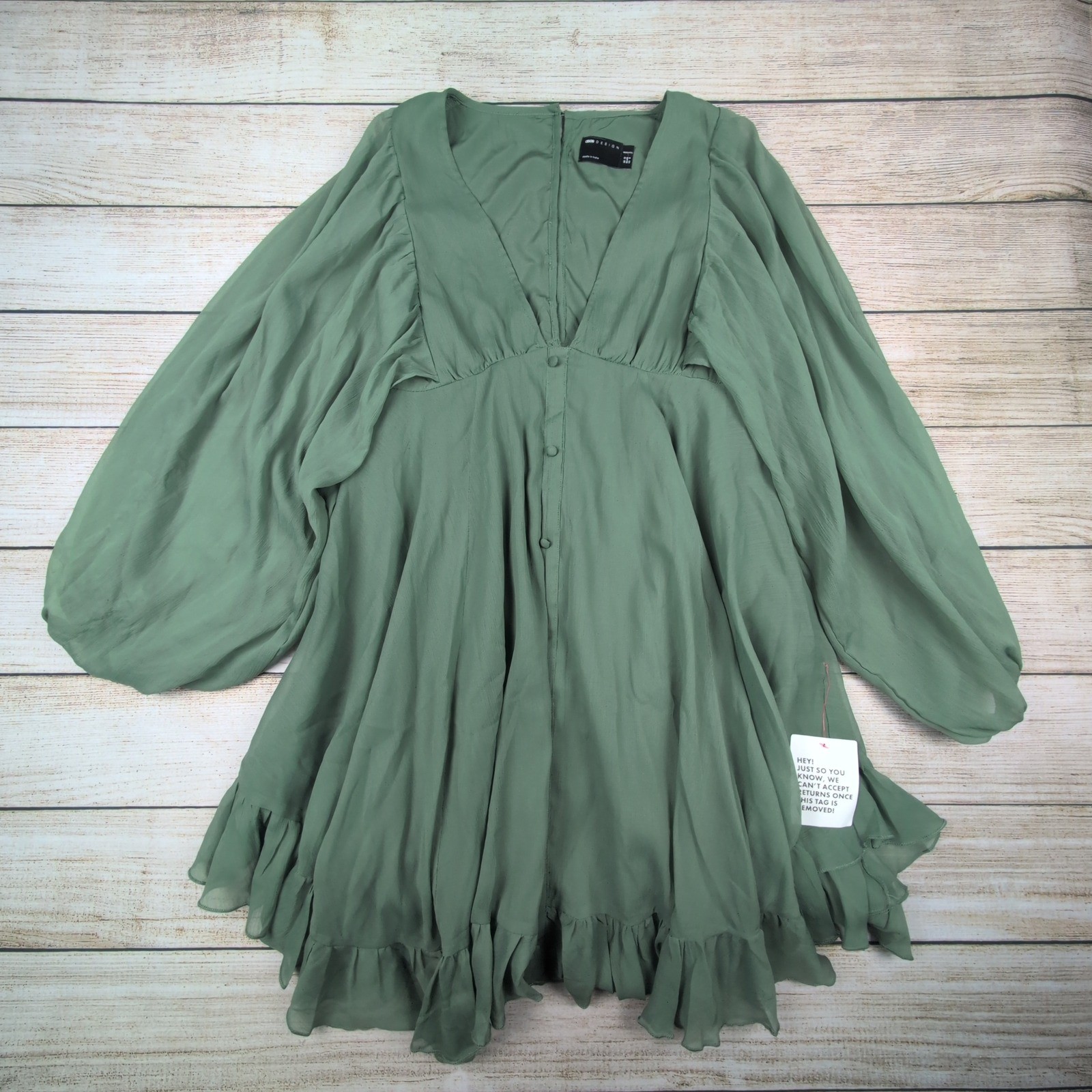 ASOS DESIGN Maternity mini dress crafted from a lightweight, textured chiffon fabric in a muted sage green. This ethereal piece features a deep V-neckline with decorative button detailing and long, voluminous balloon sleeves with elasticated cuffs. The back showcases a unique open-cutout design with button closures at the nape and a concealed zipper at the waist for a secure fit. A ruffled hemline adds a playful, feminine touch to the flowy silhouette. They've been worn, washed, and possibly witnessed some questionable decisions. Normal wear comes with the territory, and any extra drama will be shown in pics. Sizes lie, measurements don't—so trust the tape, not the tag. Thanks for shopping Love Me 2x—where every piece deserves a second chance.