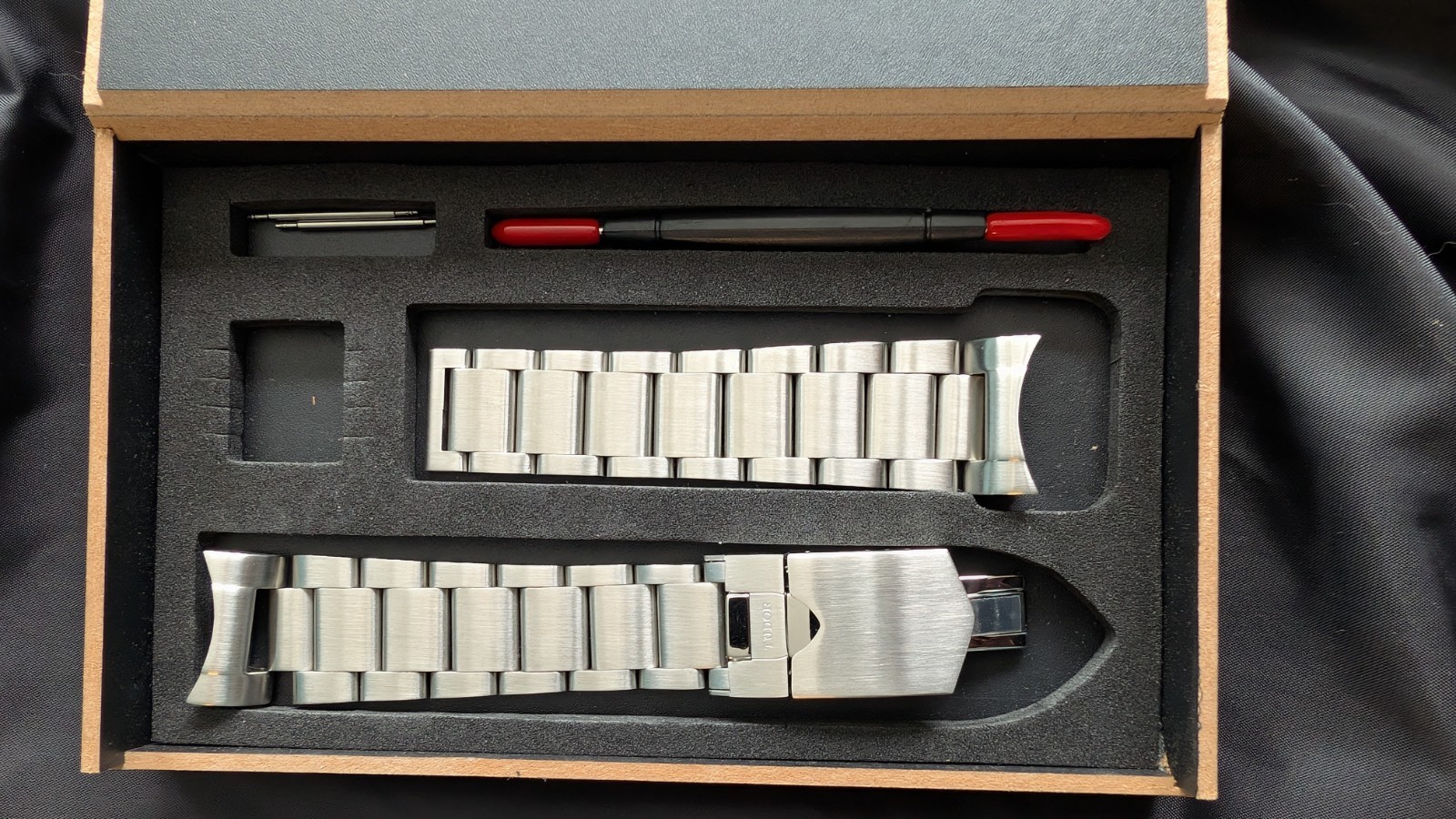 Tudor-made watch bracelet compatible with the Tudor Black Bay 41mm dive watch. this bracelet is in excellent condition and includes all links, end links, springbars, and a springbars tool. It ships in a third party box.