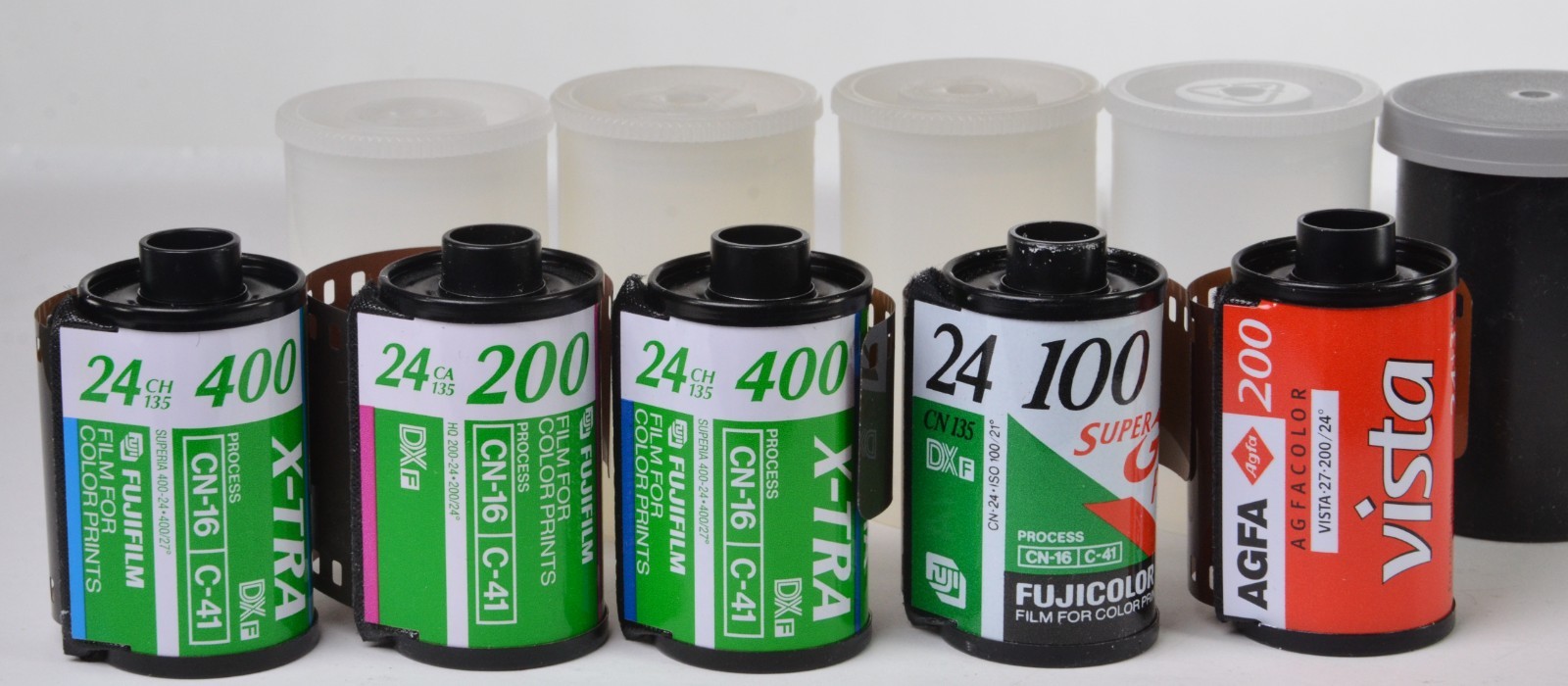 Lot of five rolls of Fujicolor film plus one roll of Agfa Vista color negative film. Two rolls Fujicolor X-Tra CH 24 exposure, one roll of Fujicolor 200 CA 24 exposure, one roll of Fujicolor 100 Superia 24 exposure and one roll of Agfa Vista 200 24 + 3 exposure. Stored in a cool and dry place, unsure of expiration date. Likely around 2010.