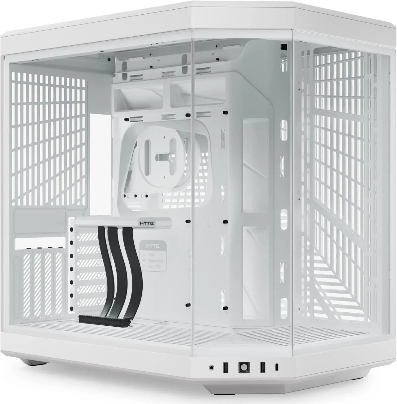 Y60 Modern Aesthetic Dual Chamber Panoramic Tempered Glass Mid-Tower ATX Computer Gaming Case - White - PCIe 4.0 Riser Cable Included. No corner pillar. The Y60 features a 3-piece panoramic tempered glass design for the ultimate photo and display potential.