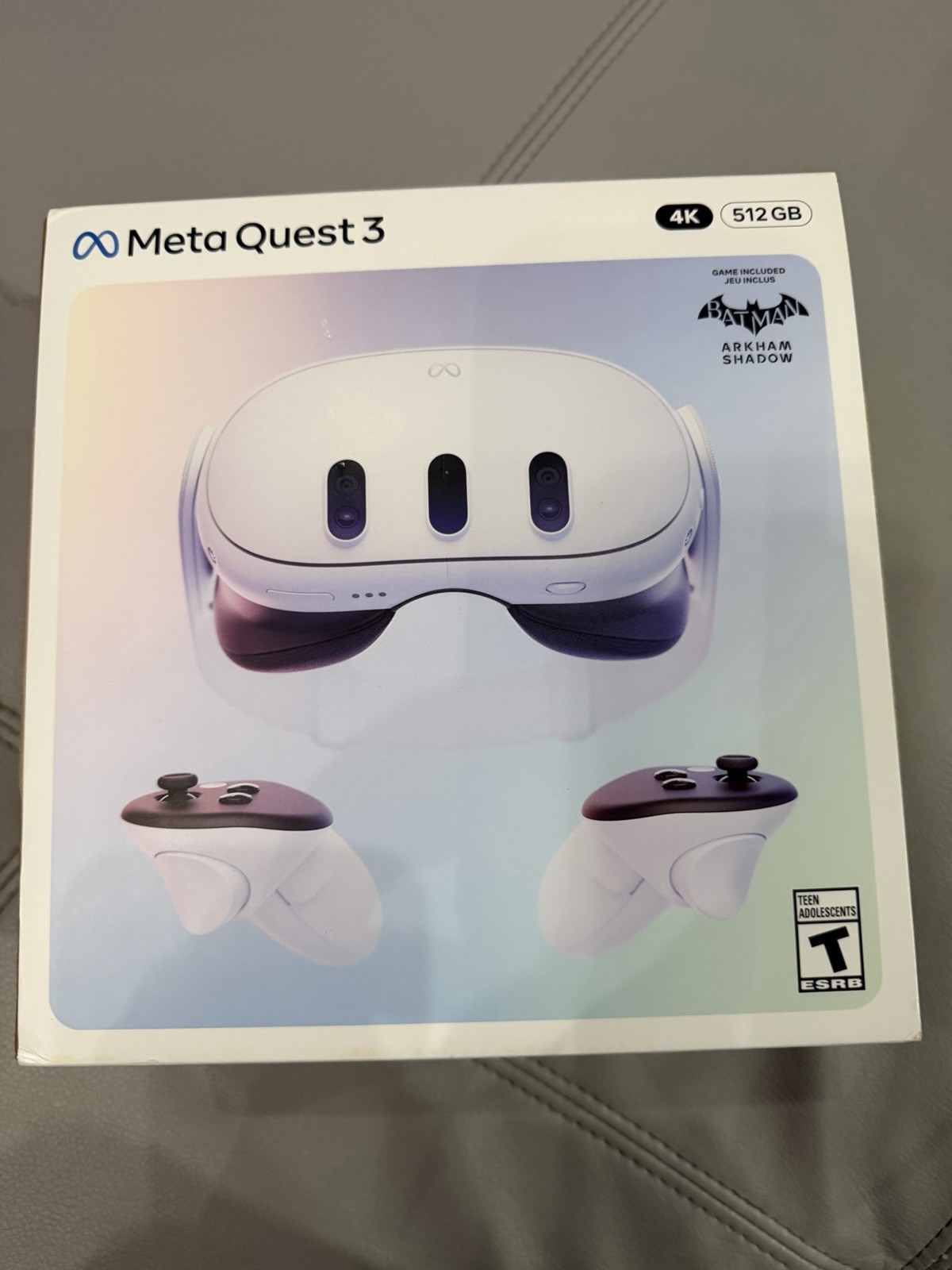 Selling a [Like New] Meta Quest 3 512GB VR headset. This is the high-capacity model featuring stunning 4K+ resolution and full-color mixed reality capabilities. What’s Included: Meta Quest 3 Headset (512GB): Plenty of space for all your games and apps. Batman: Arkham Shadow: The critically acclaimed exclusive VR game. $100 Meta Gift Card: A bonus for the buyer to use on the Meta Horizon Store. Original Accessories: Includes two Touch Plus controllers and all standard cables/documentation.