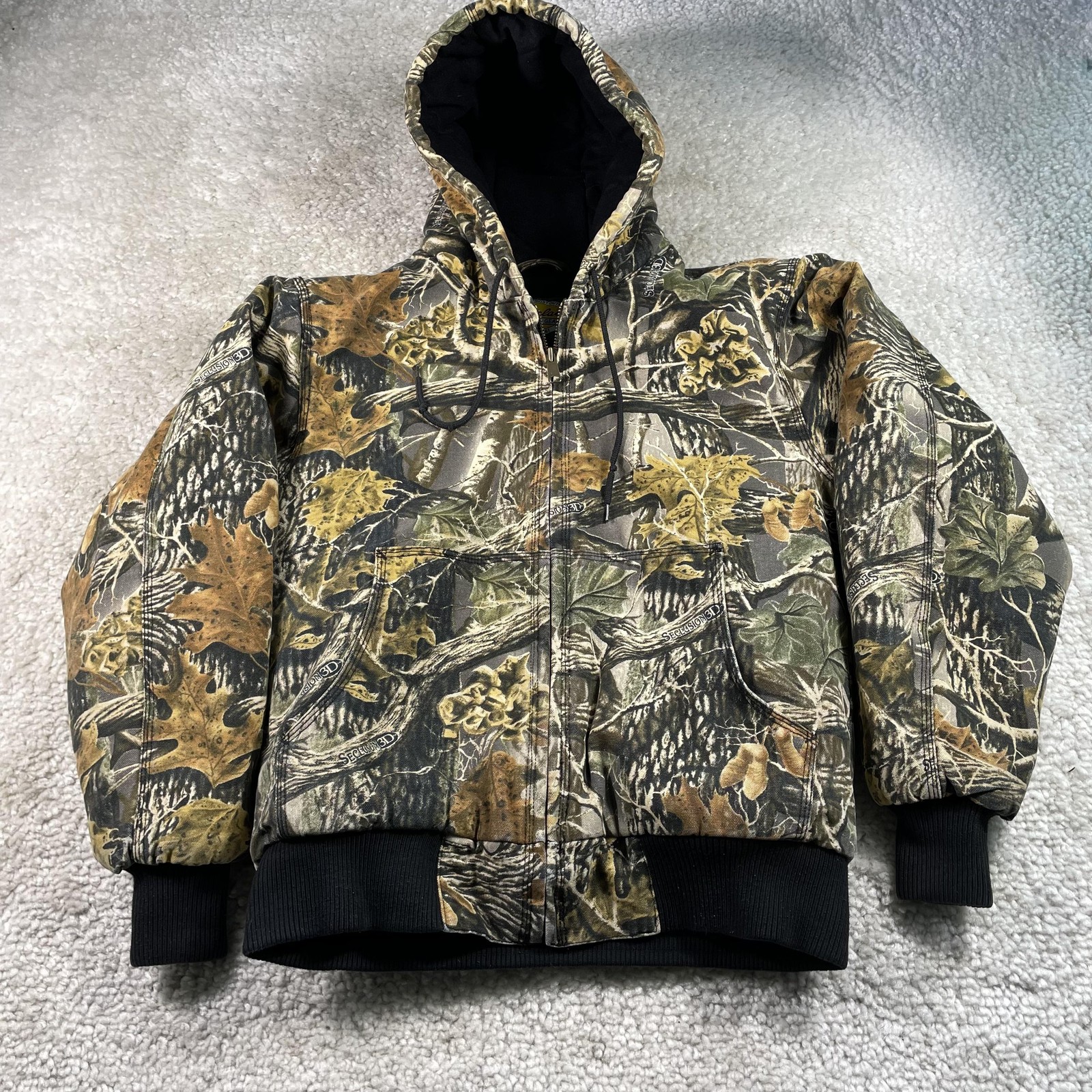 Color/Pattern: Multicolor Seclusion 3D camouflage print in shades of brown, green, tan, and black. Details: Full front zipper closure, attached drawstring hood with soft black lining, two front hand pockets, interior zip chest pocket with camo trim, rib knit cuffs and waistband for a secure fit, quilted interior lining, and Cabela's Outdoor Gear logo patch at the inner neck.