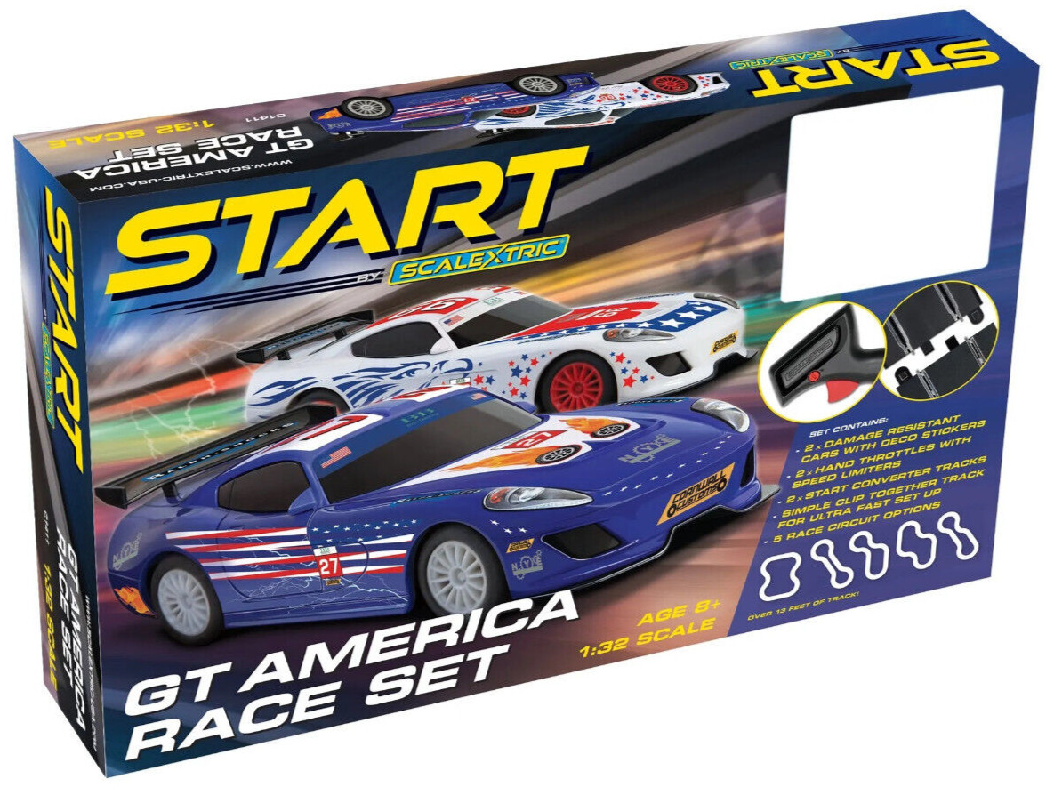 Scalextric Start GT America 1:32 Scale Slot Car Race Track Set C1411T Lights out, let's get racing! It's time to plan your circuit layout, place your cars on the track and see who is going to take the chequered flag, with the arrival of our new START GT America Race Set. Simply connect your track together, following one of five circuit layout suggestions, decorate your cars and start racing ¦.. who has the skill to keep their car on the track and take the title of house champion? With two damage-resistant cars and simple track assembly, the new START GT America Race Set is all about getting into the racing action quickly, with the serious challenge of discovering the future stars of the exciting Scalextric world - do you have what it takes to be a scale track champion? This item will be supplied with a USA transformer