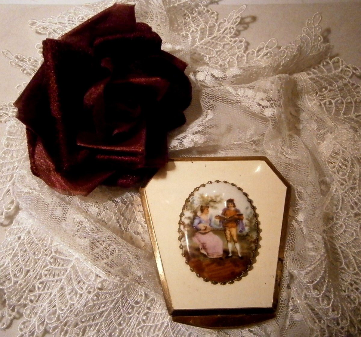 Vintage Gold Tone Cream Enamel Courting Couple Hexagonal Powder Compact - Unique