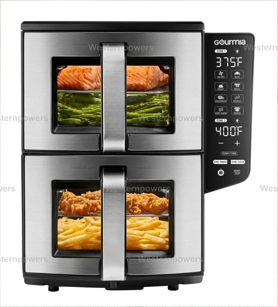 Gourmia 11-QT 4-Layer Cooking Air Fryer. 8 1-TOUCH FUNCTIONS: Air Fry, Bake, Roast, Broil & More. 4-LAYER COOKING: Use Racks to Cook 4 Dishes at Once. SYNC FINISH: Cook Different Foods and Finish Together.