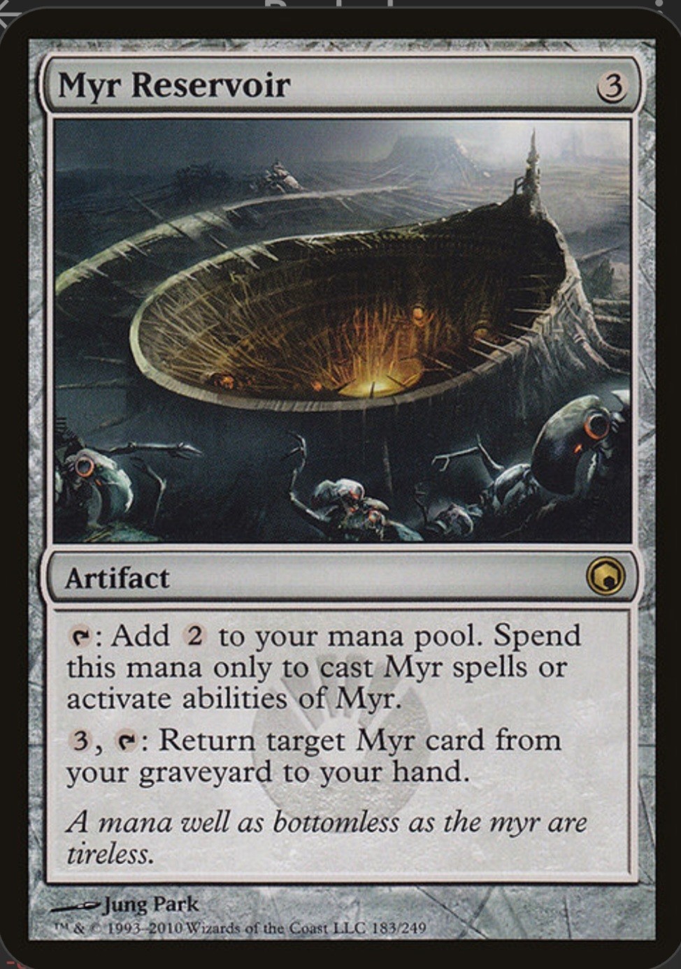 The Myr Reservoir card is a rare artifact from the Scars of Mirrodin set in the Magic: The Gathering game. Illustrated by Jung Park, this English-language card has a colorless attribute and costs 3 to cast. With a regular finish, this card is a valuable addition to any Magic: The Gathering collection.