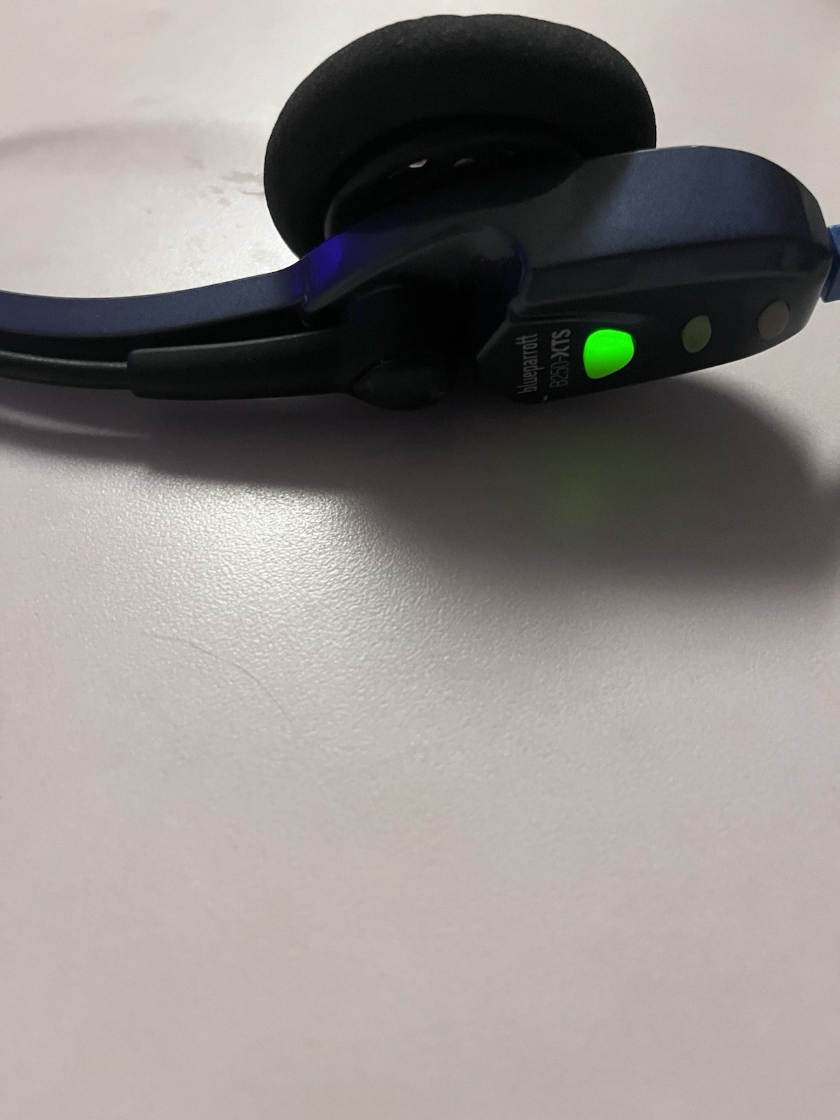 The Blue Parrott B250-XTS USB-C Bluetooth Wireless Trucker Headset is a single earpiece headset with a stylish blue color and a modern headband form factor.