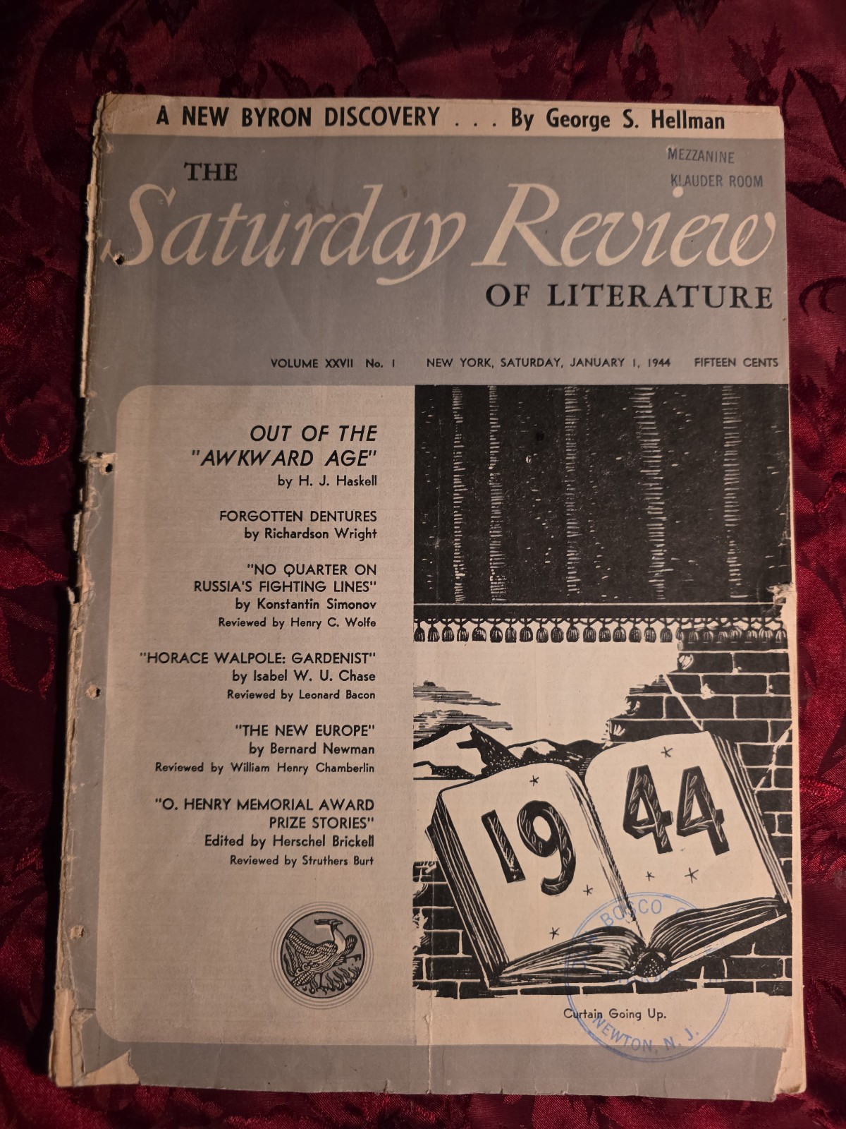 On sale • save 25%OUT OF THE "AWKWARD AGE", By H. J. Haskell. FORGOTTEN DENTURES, By Richardson Wright. ISSUE DATE: January 1, 1944; VOL XXVII, NO. 1. COVER:"1944 Curtain Going Up.". No QUARTER ON RUSSIA'S FIGHTING LINES By Konstantin Simonov, Reviewed by Henry C. Wolfe.