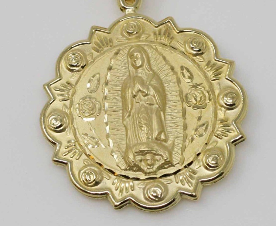 The product is a large, heavy vintage Catholic medal featuring the image of Our Lady of Guadalupe and the Sacred Heart of Jesus. This collectible item is proudly displayed as a symbol of faith and spirituality within the Christianity religion. Made with craftsmanship and attention to detail, this medal serves as a tangible representation of devotion and reverence for the sacred symbols depicted. Gold plated with inset cz stones No chain