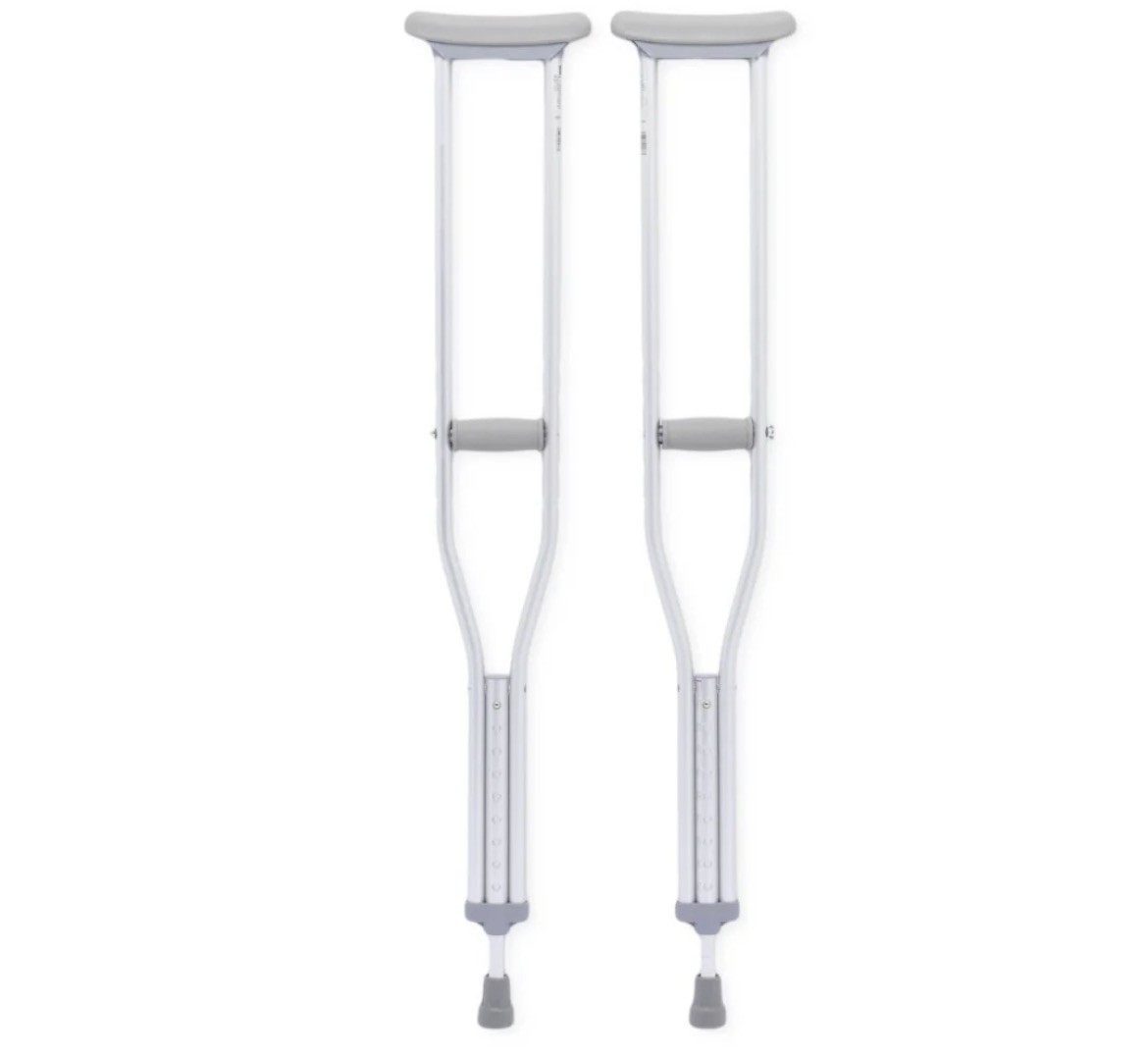 Made of durable aluminum material, these standard crutches feature adjustable height and a comfortable handgrip.
