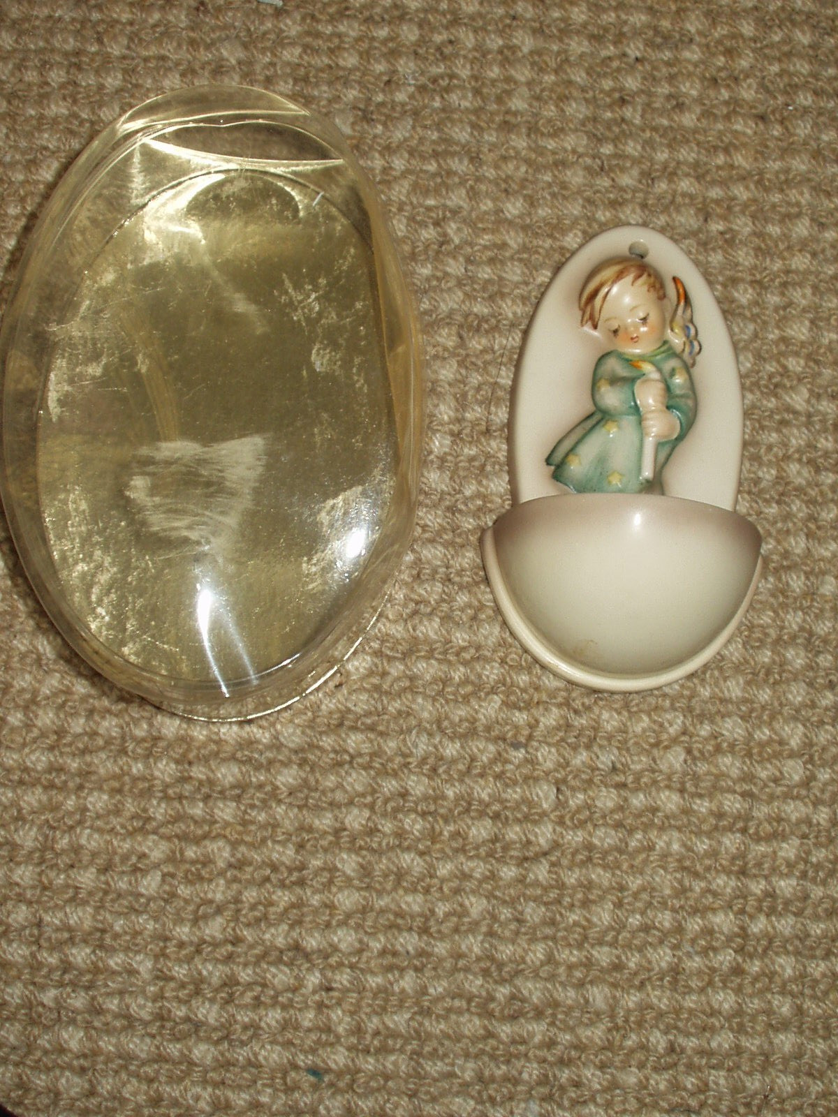 In its original plastic "egg" (packaging has some creasing - and with its original Woolworth's label is a Hummel holy water font. It's 5" high in perfect condition.