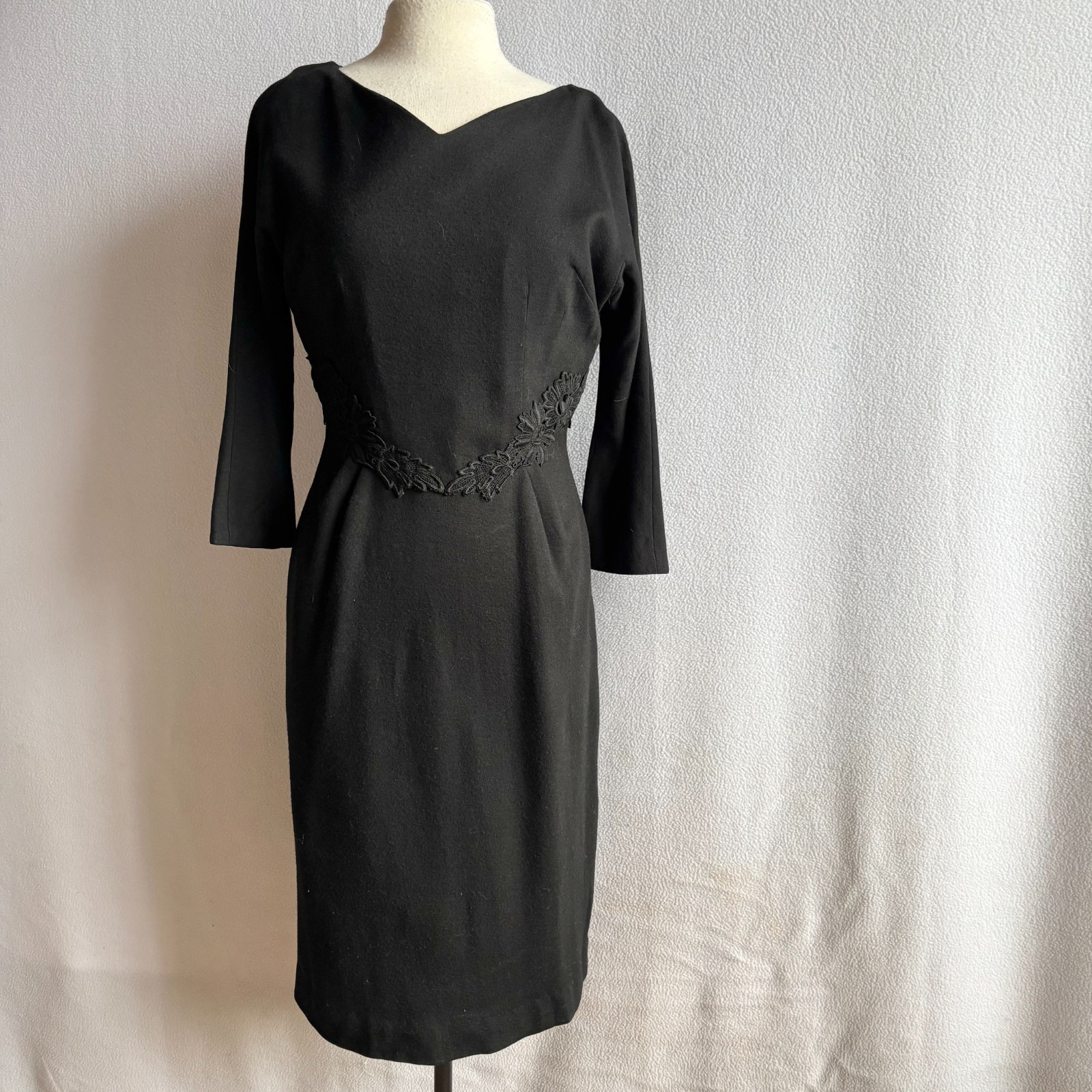 Vintage Curvy 1950s 1960s Jon McCauley Little Black Wool Sheath Dress LBD M