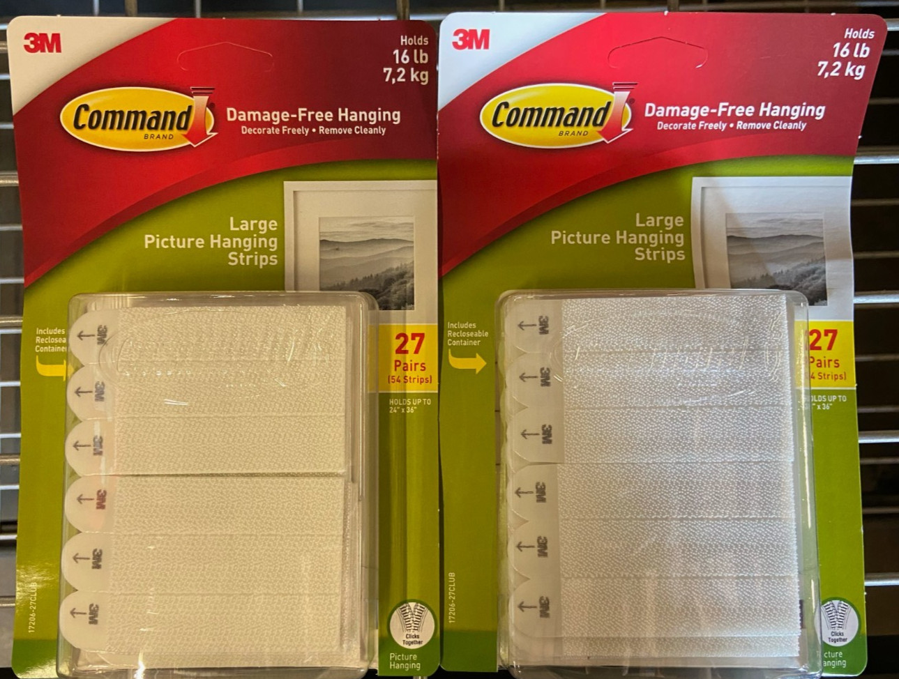 Command Large Picture Hanging Strips White 54 Pairs(27 Pairs/Pack) Decorate how you want, when you want without damaging your walls. Command Picture Hanging Strips let you fearlessly hang pictures without nails or tools. These strips provide a hassle-free and damage-free solution for decorating your space, allowing you to easily hang and reposition items without leaving holes, marks or sticky residue on your walls. Command Strips are designed to hold strongly on a wide range of indoor surfaces. Whether its painted walls, finished wood (such as painted or varnished shiplap, cabinets or doors), painted concrete cinder block, laminate, glass, tile, metal or other smooth surfaces, these strips provide a reliable and secure hold. This versatility allows you to confidently hang your items without worrying about them falling or causing damage to the surface. This means you can confidently decorate your space without worrying about any unsightly damage. When its time to remove or reposition your items, simply follow the instructions provided by Command to ensure a clean and easy removal process. With Command Picture Hanging Strips, you can keep your walls looking beautiful while enjoying the freedom to decorate and personalize your space. Not just for picture frames, these wall hangers are also great for creating a gallery wall, hanging college dorm decor, wooden letters, nursery Decor, acoustic foam boards and more. These picture frame hangers click together to lock in place and keep your pictures level. These strips are a convenient and damage-free solution for hanging various items on walls.
