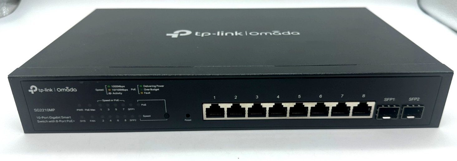 On sale • save 10%Model:TL-SG2210MP | 8-Port PoE+ (121W) | 2 SFP Slots. TP-Link JetStream 10-Port Gigabit Smart Switch. 1x TP-Link TL-SG2210MP JetStream Switch. High-Speed Connectivity: 8× Gigabit RJ45 ports and 2× Gigabit SFP slots for high-speed fiber uplinks.