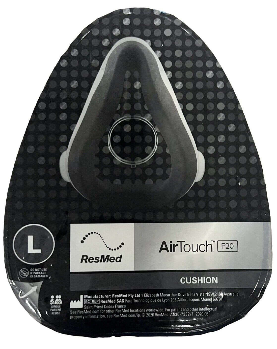 This is a "Brand New and Never Used" item NEW Resmed AirTouch F20 full face cushion REPLACEMENT only, size Large Please be advised: This item does not come with frame, headgear, elbow, or in it's original packaging . THIS IS A REPLACEMENT PART AND DOES NOT REQUIRE A PRESCRIPTION ! This Part is Brand New and was removed from a Mask Kit to meet both E-Bay's and FDA Regulations