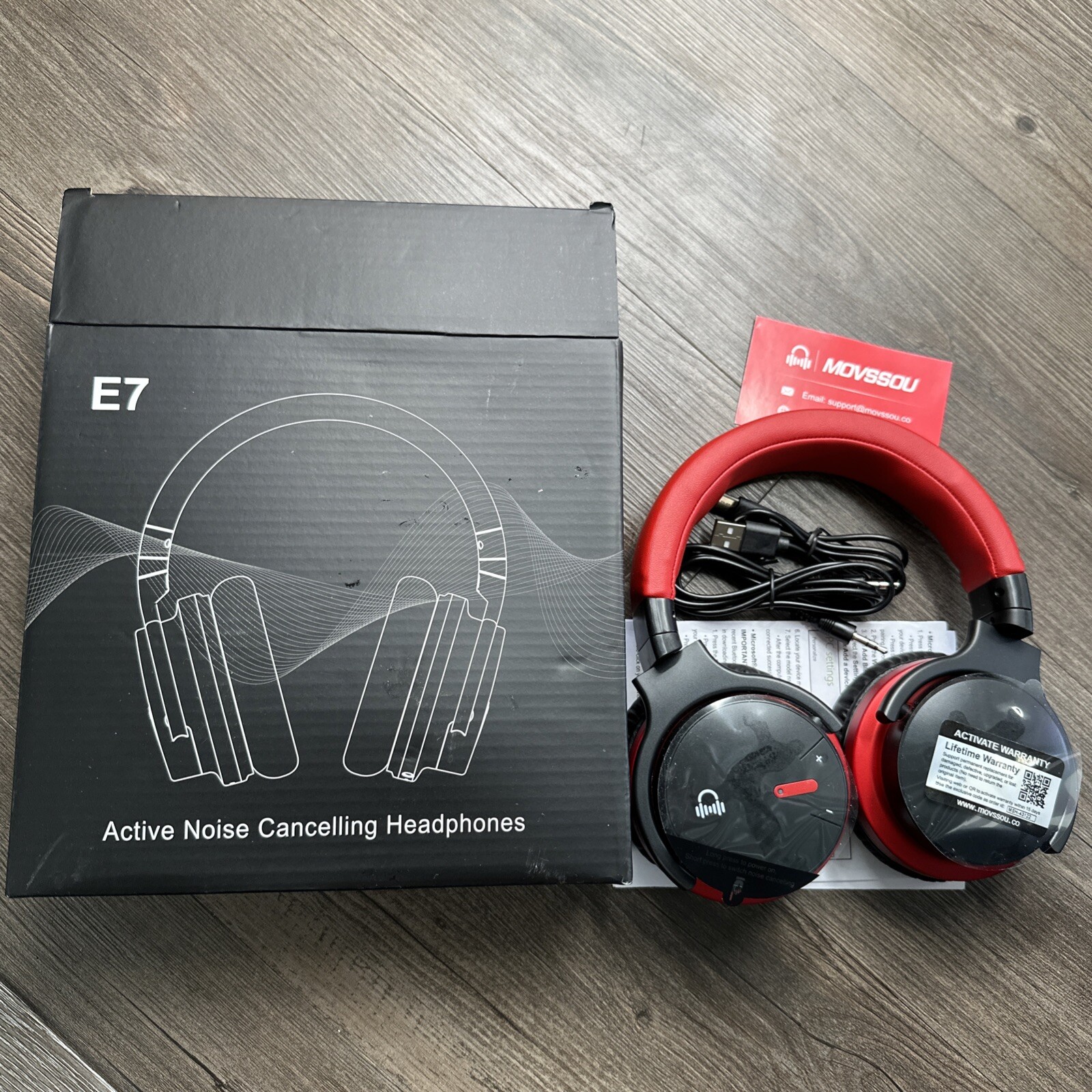 On sale • save 40%The "Auriculares inalámbricos con cancelación de ruido sobre la oreja Bluetooth" are red and black wireless over-ear headphones with a built-in microphone. They are designed for wireless use with Bluetooth technology and feature active noise cancellation. The headphones have a headband form factor and ear-cup design, providing a comfortable fit for extended use. The model, "E7 Wireless Noise Cancelling Headphones," by Movssou, offers a frequency range suitable for a high-quality audio experience. Ideal for those seeking wireless, Bluetooth over-ear headphones with noise-canceling capabilities.