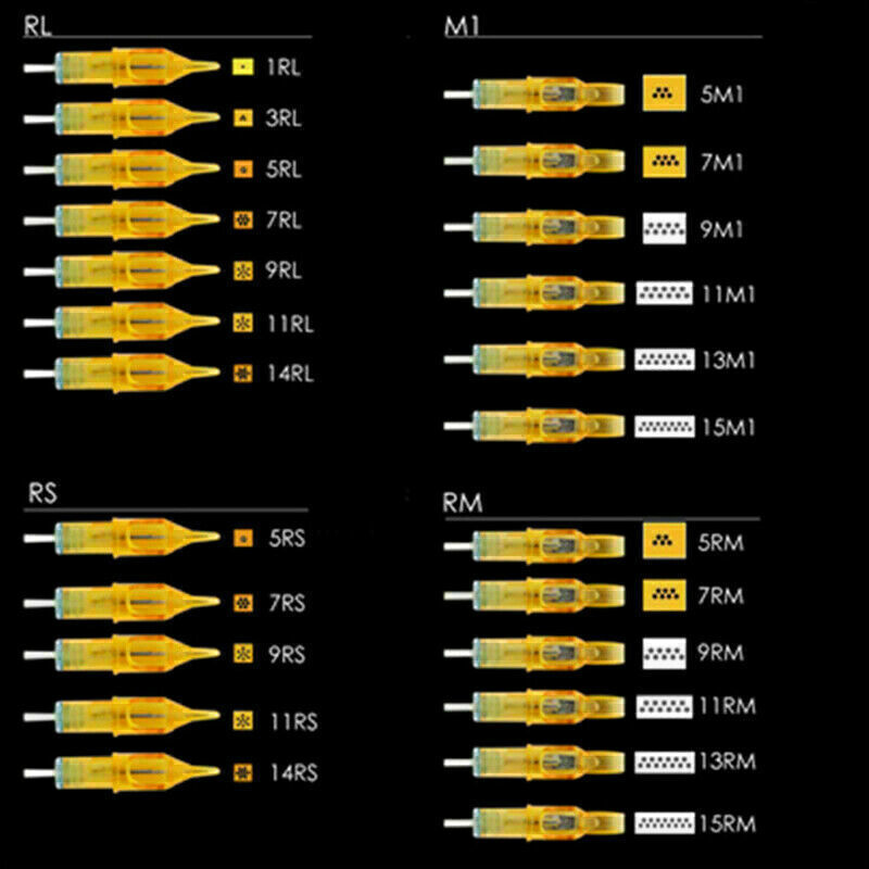 Single Stack Magnum Shader (M1) size: 5, 7, 9, 11, 13, 15. Round Magnum (RM) size: 5, 7, 9, 11, 13, 15. Round Liner (RL) size: 1, 3, 5, 7, 9, 11, 14. Professional standard length loop bars fit all tattoo machines.