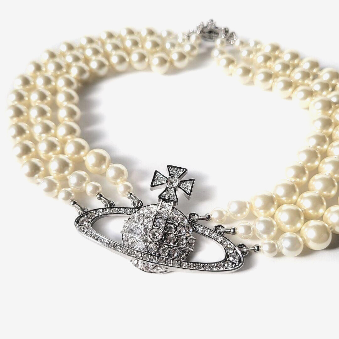 Vivienne Westwood Three Row Triple Layer Pearl Silver Necklace Choker