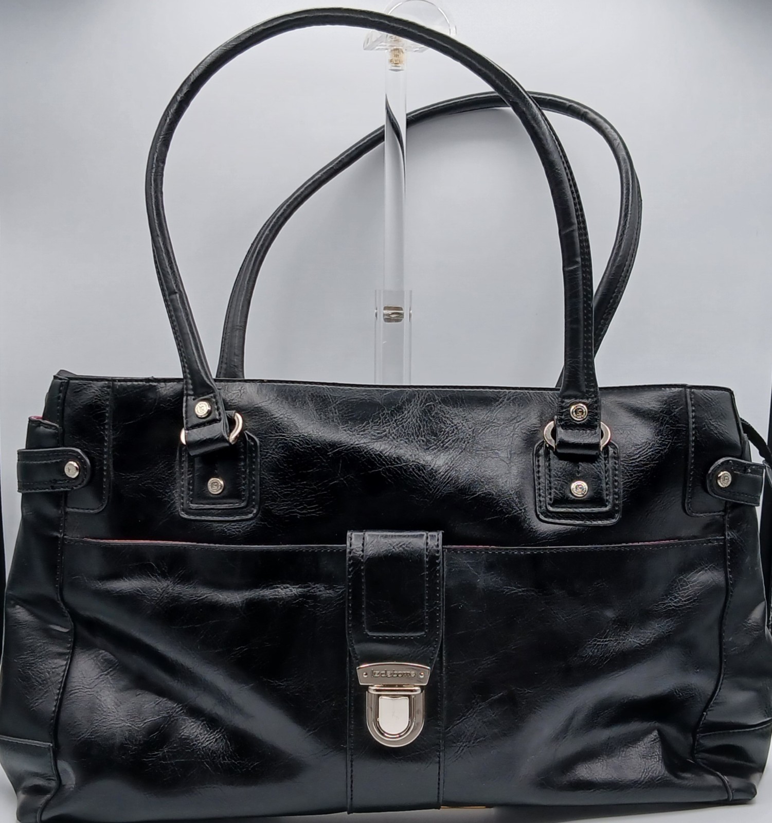 The Liz Claiborne bag is a black tote or shoulder bag, likely made of genuine leather material with gold-tone hardware. Pockets and Closure: The bag has a large front slip pocket secured by the D-clasp tab.