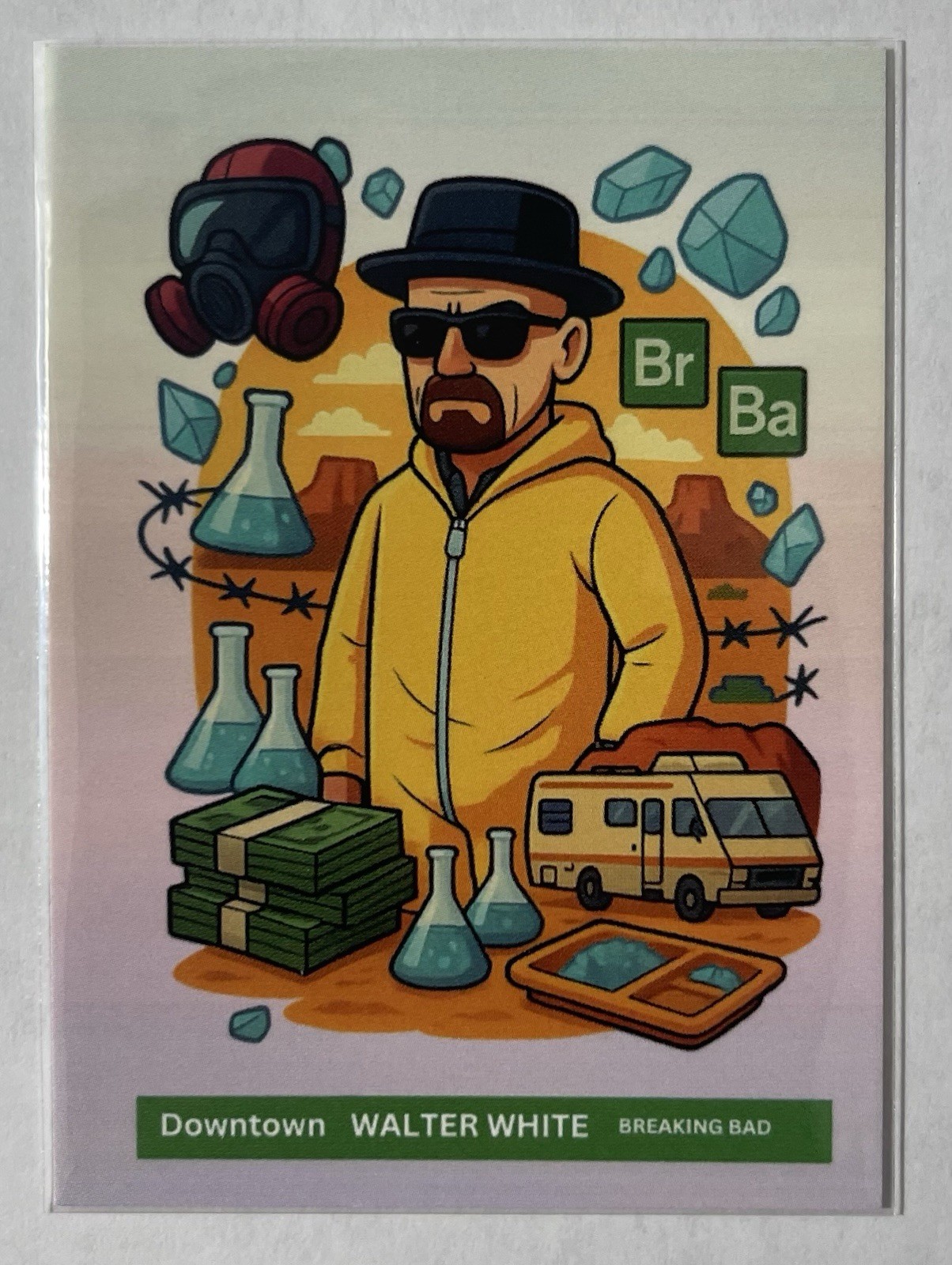 The product is a rare and custom sports trading card featuring Walter White from the popular TV show "Breaking Bad." The card is part of the downtown variety and is in near mint or better condition. It is associated with the Albuquerque football team and is from the 2025 season. This unique and collectible item would be a valuable addition to any sports memorabilia collection.