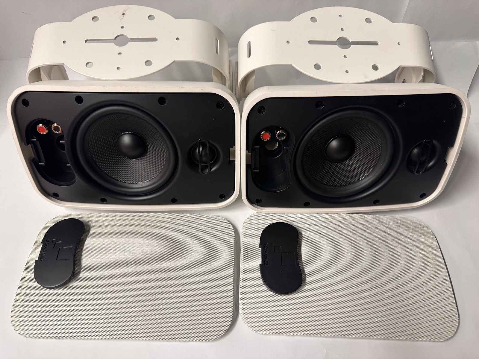 (2) Sonance Mariner 54 speakers. (2) Original Sonance wall mount brackets. (2) Sonance logo badges. These are 5-1/4" 2-way weatherproof speakers, designed for outdoor and marine use. Weatherproof / outdoor rated (IP66).