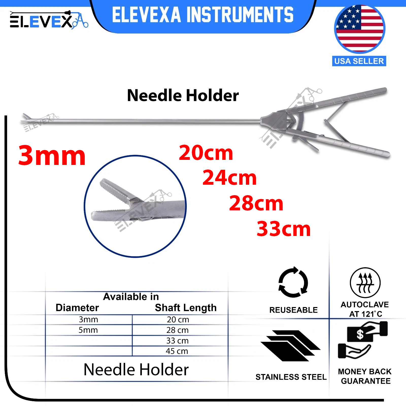 On sale • save 20%ELEVEXA® 3mm Needle Holder Straight Laparoscopy Paediatrics Laparoscopic Pediatrics 20cm 24cm 28cm. Common Uses : Laparoscopy. Available working length of shaft: 20cm / 24cm / 28cm. 1 x Needle Holder 3mm.