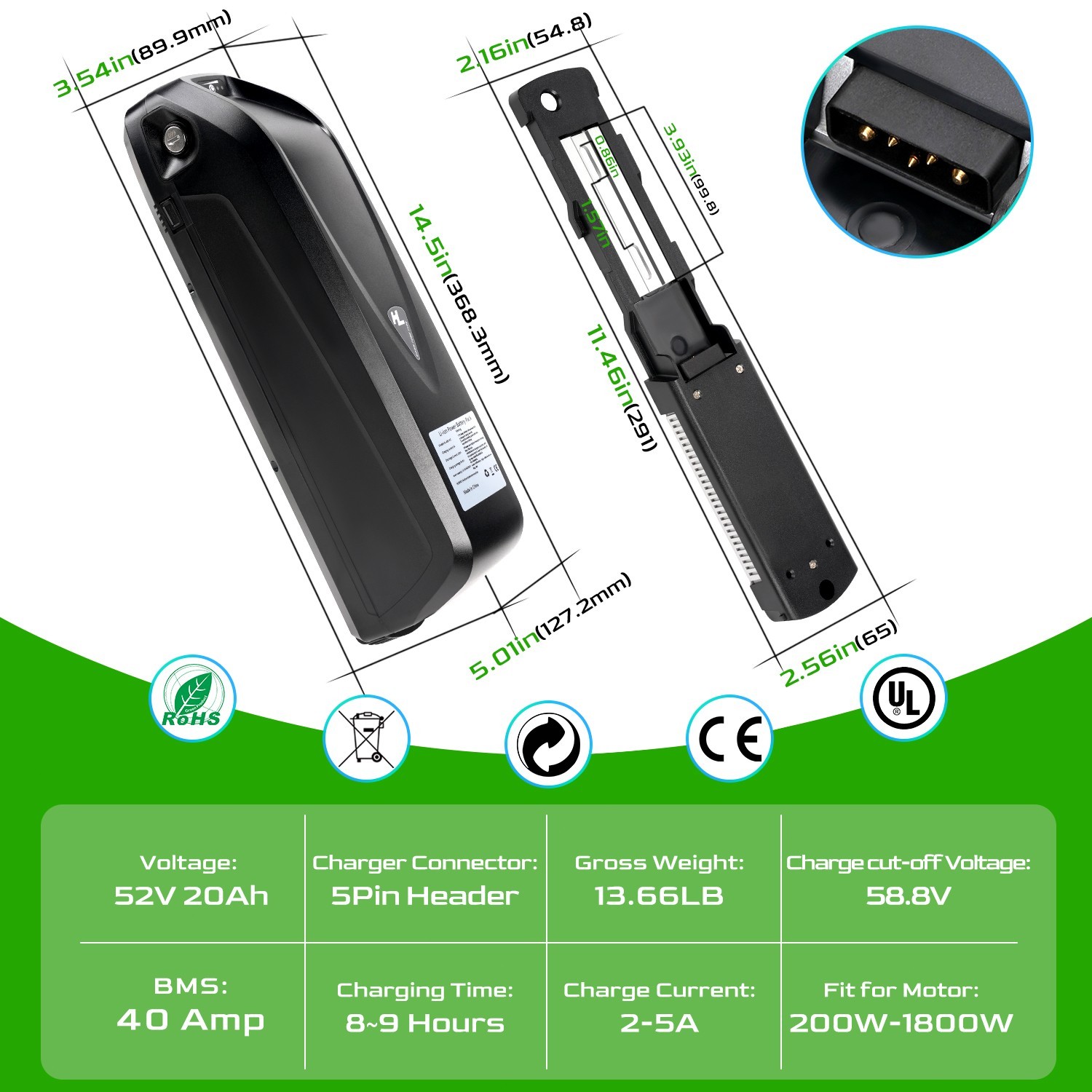 52V/48V 12.5Ah/15Ah/20Ah/Hailong Ebike Lithium Battery For 200W-1800W Motor BMS
