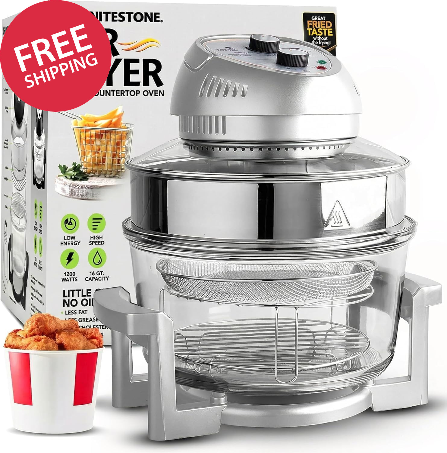 Big Boss 16Qt Large Glass Air Fryer Non Toxic – Family Sized Large Halogen Oven Cooker with 3 Cooking Sections, Stainless Steel Racks, French Fries, Chicken, No Preheat, Self Cleaning, Dishwasher Safe.